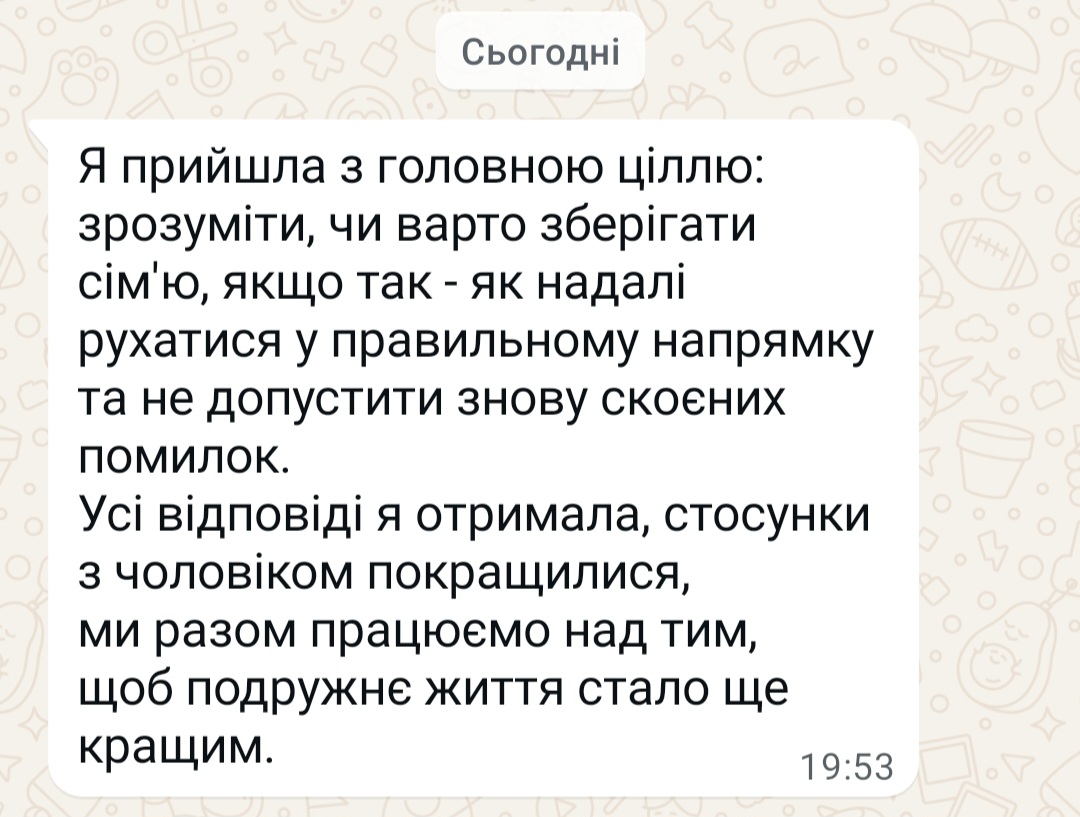 Ви навчитеся спілкуватися без звинувачень, навіть коли є біль чи образа. Разом з чоловіком пропишете нові домовленості про кордони, підтримку, і спільні дії для відновлення стосунків.