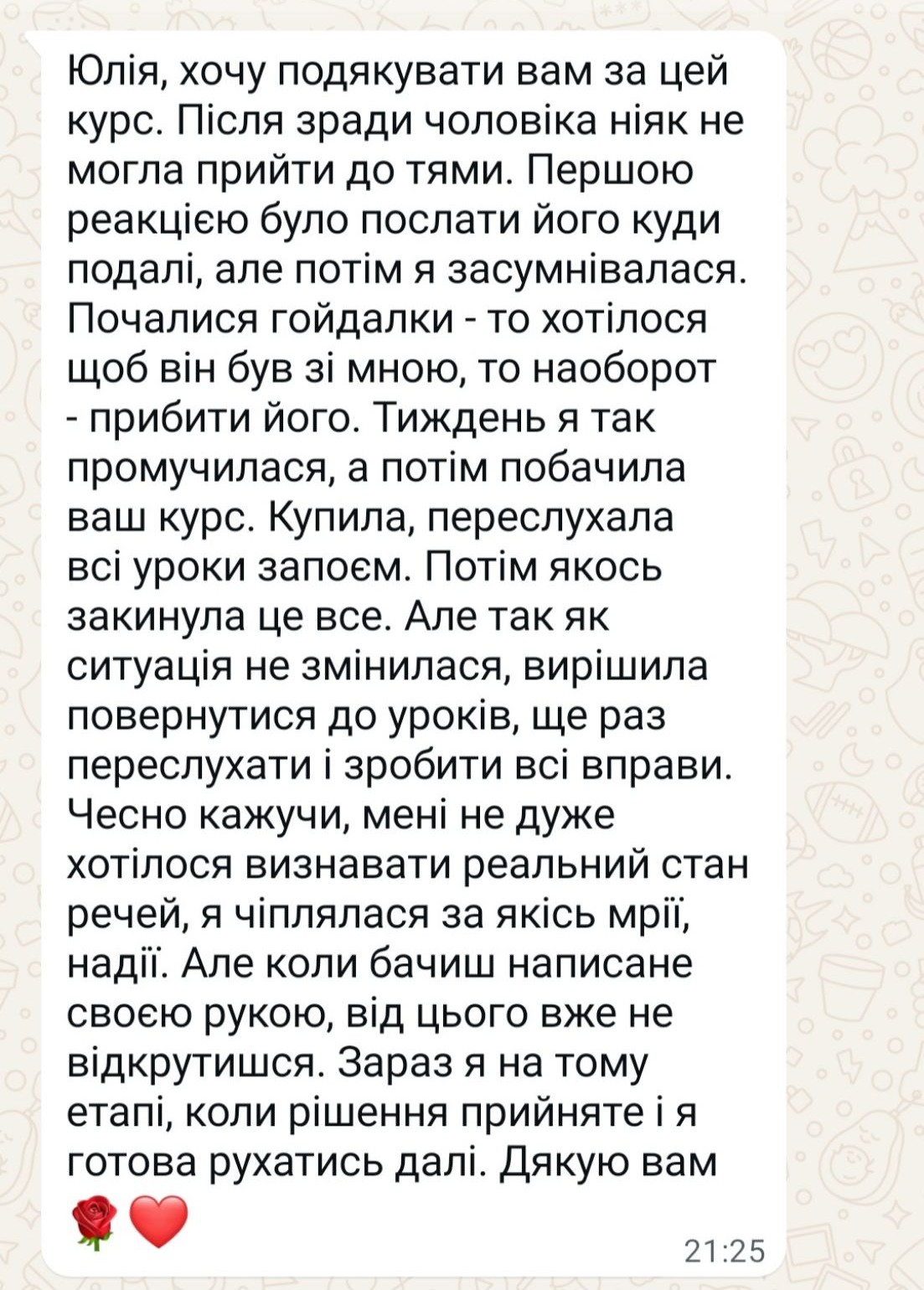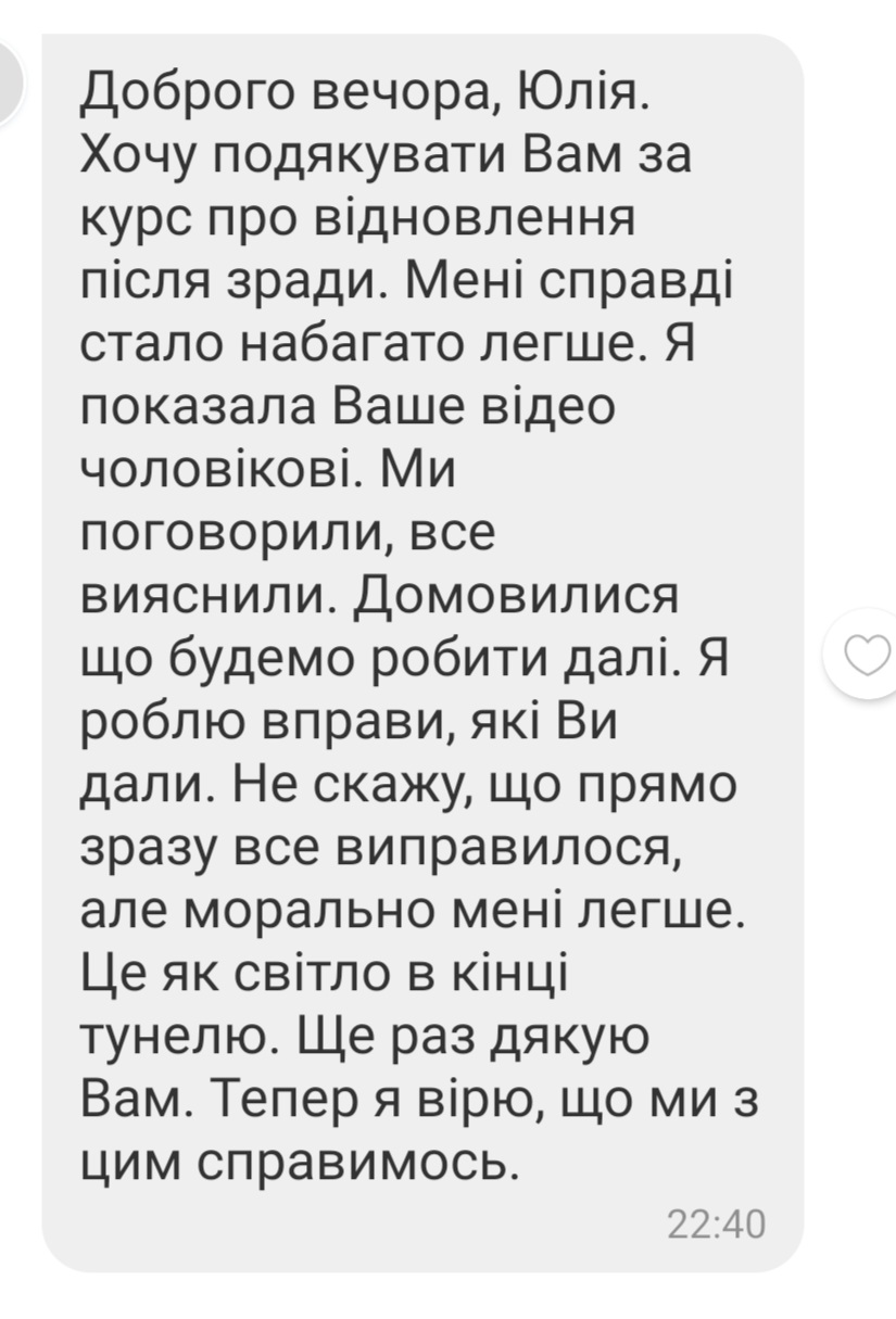 В моєму житті також бували зради. Тож не тільки з клієнтського, а й з власного досвіду знаю, наскільки болючим і виснажливим може бути період віддновлення самотужки.
